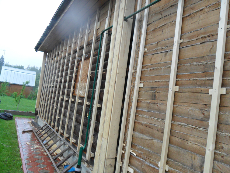 Если стены дома деревянные, их тоже желательно обработать огнебиозащитным составом. Также можно дополнительно укрыть стену паропроницаемой мембраной из специальной плёнки типа TAVEK, её можно крепить степлером. Такие плёнки имеют разные свойства, в зависимости от стороны устанавливайте плёнку таким образом, чтобы она выпускала из дома пар, а обратно влагу не впускала.
